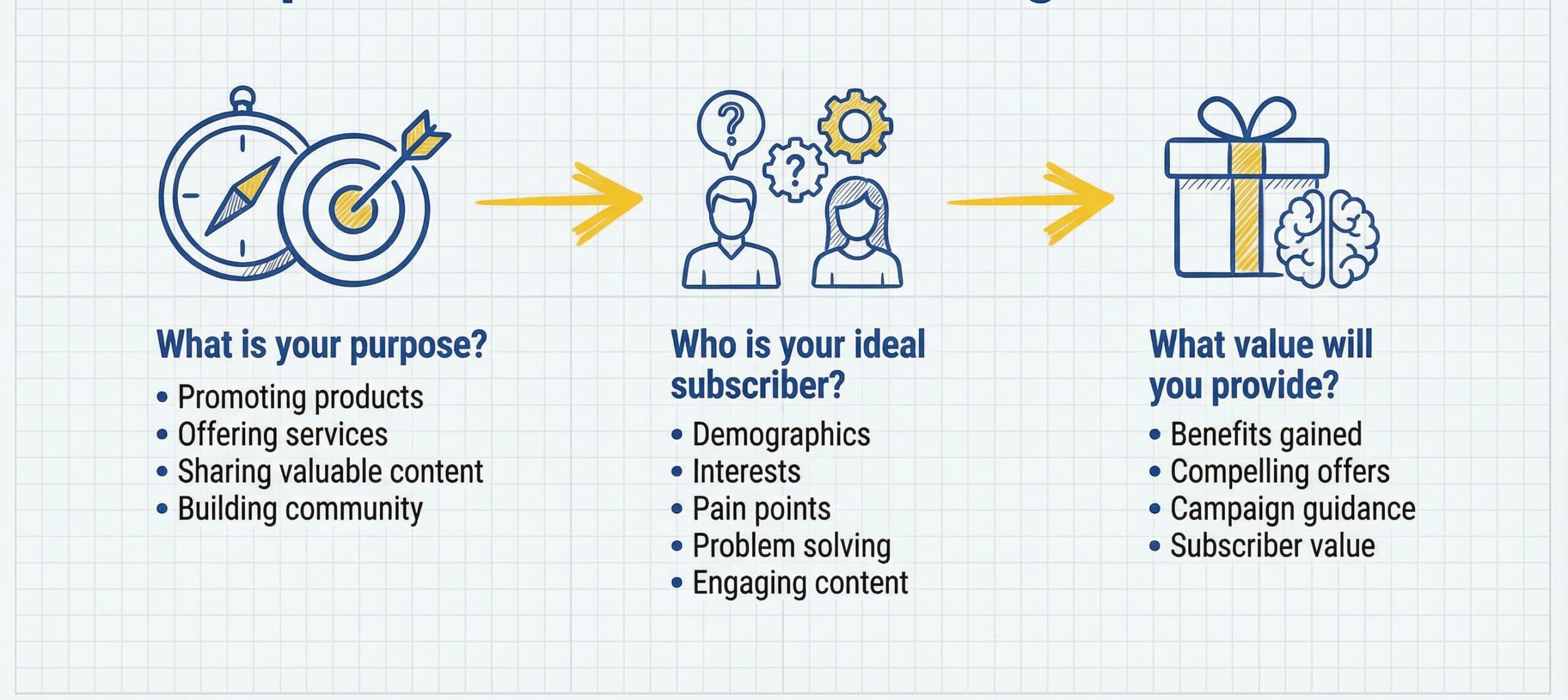 - What value will you provide? Think about the benefits subscribers will gain by joining your list. Defining this will help you create compelling offers and campaigns.