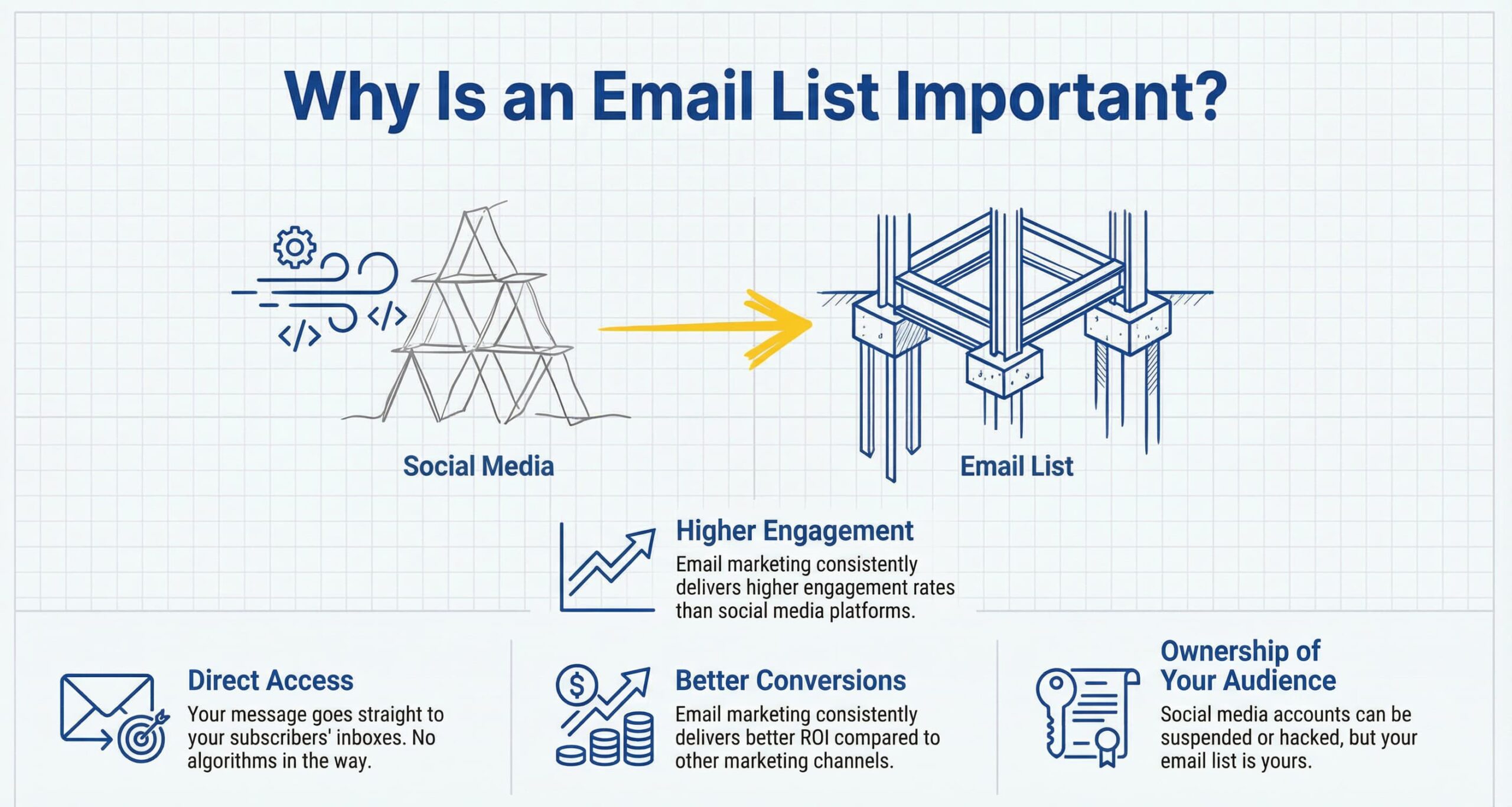 - Ownership of Your Audience: Social media accounts can be suspended or hacked, but your email list is yours.