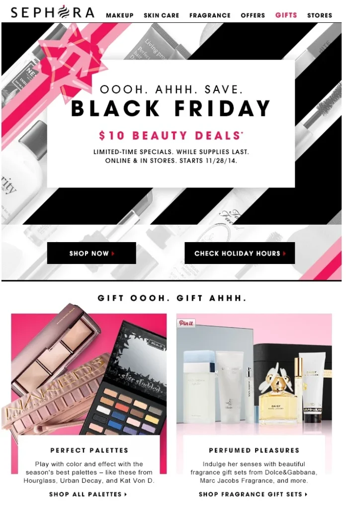 Sephora’s seasonal campaigns are a strong example. For Black Friday, they use a sleek black-and-white design with one bold headline and a single “Shop Now” button. For the New Year, they pivot to bright colors and copy like “Start the year with confidence” while promoting skincare bundles. Each design is seasonal, yet always clean and focused.