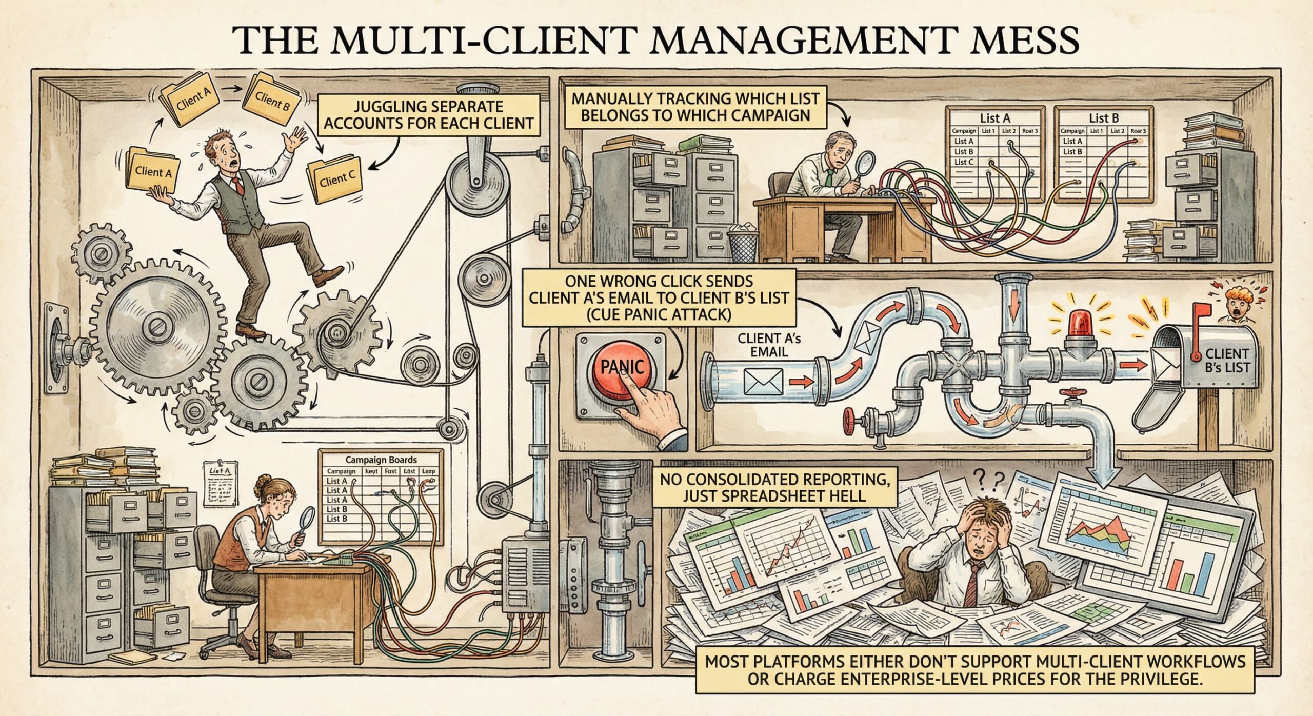 - One wrong click sends Client A’s email to Client B’s list (cue panic attack)