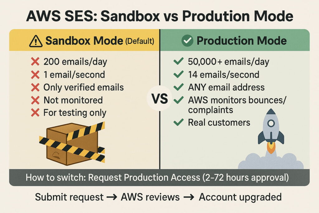 By default, AWS limits you to 200 emails per day (sandbox mode). Request Production Access to unlock full sending capacity.