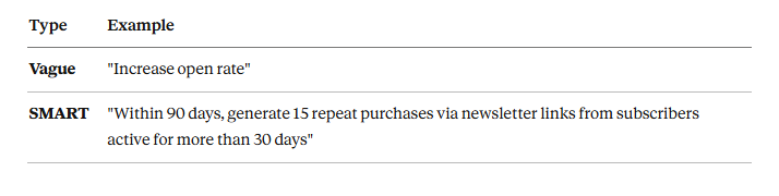 - Starting without a S.M.A.R.T. goal. Sending company news is not a goal. Without a specific, measurable target, you’ll waste months sending emails that generate zero revenue.