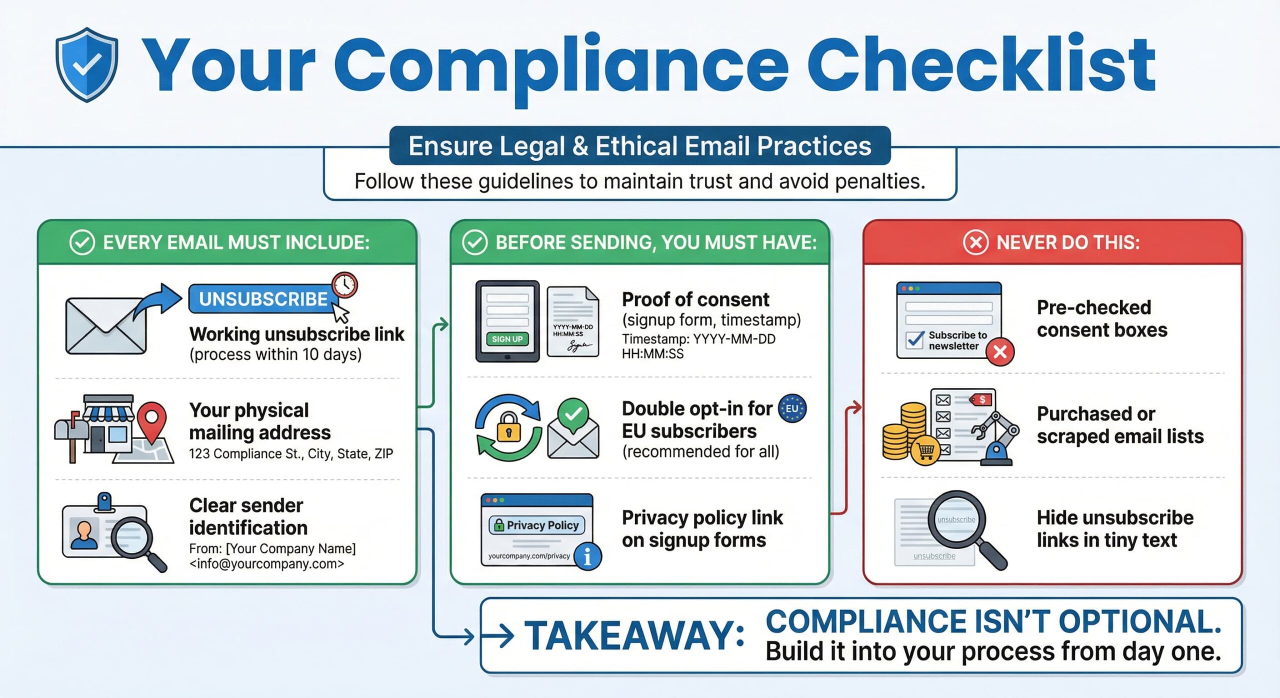 Compliance First: Review legal requirements (CAN-SPAM, GDPR) and our compliance checklist below. Ready for the full guide? Let’s dive in.