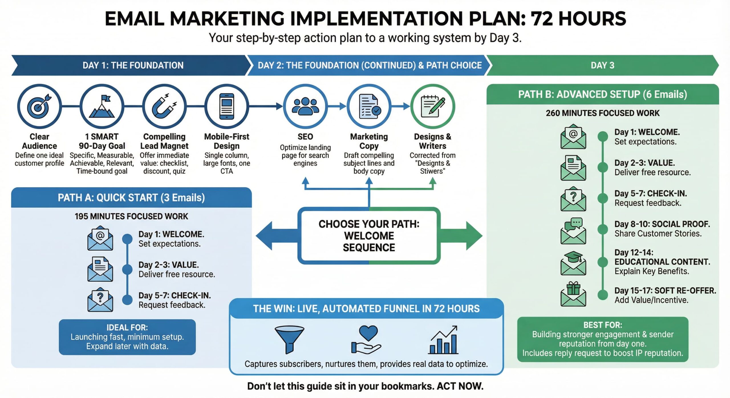 Email marketing is a system, not magic. Your first customers won’t come from complex automation. They’ll come from making these eight strategic decisions and executing them consistently over your first 90 days.