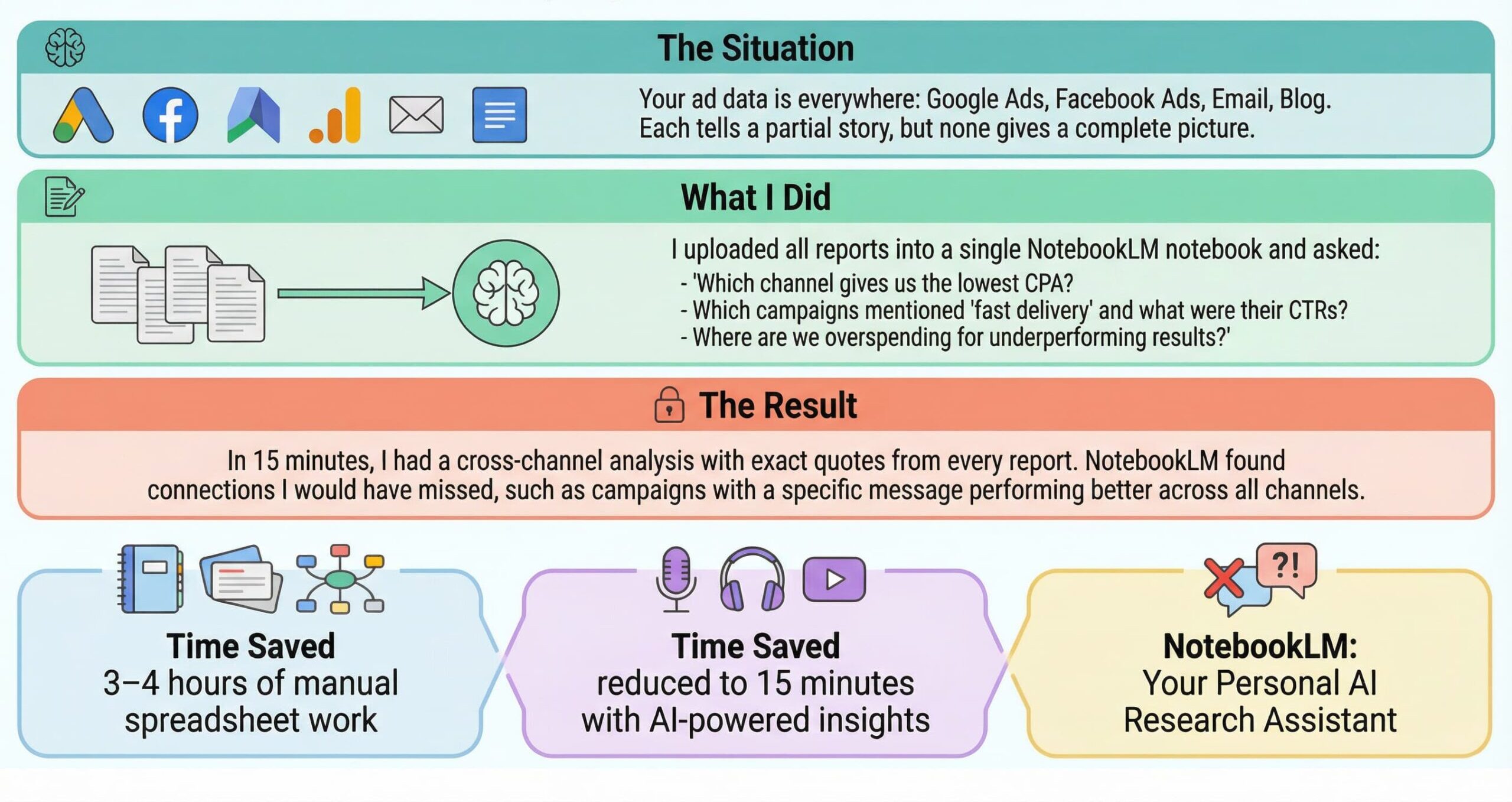 The result: NotebookLM reconstructed the timeline and cause-and-effect relationships. You get an honest breakdown: not “we got unlucky” but “we changed creatives on March 15, after which CTR dropped 20%.” Gold for leadership reports and improving future campaigns.