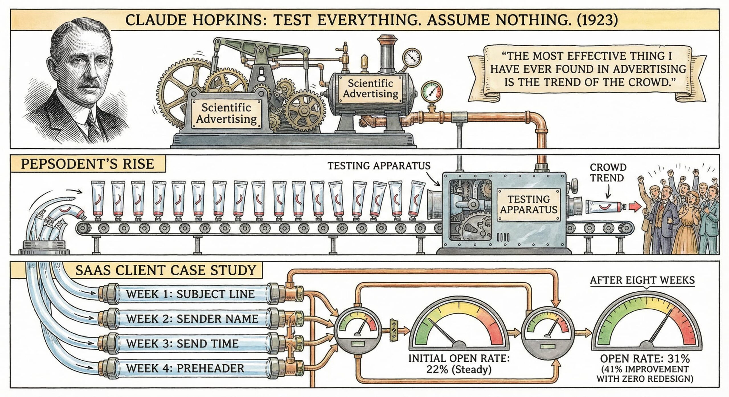 Hopkins wrote Scientific Advertising in 1923, a book Ogilvy said nobody should work in advertising without reading seven times. He turned Pepsodent into America’s best-selling toothpaste, not through creative brilliance, but by testing dozens of angles until he found the one that worked.