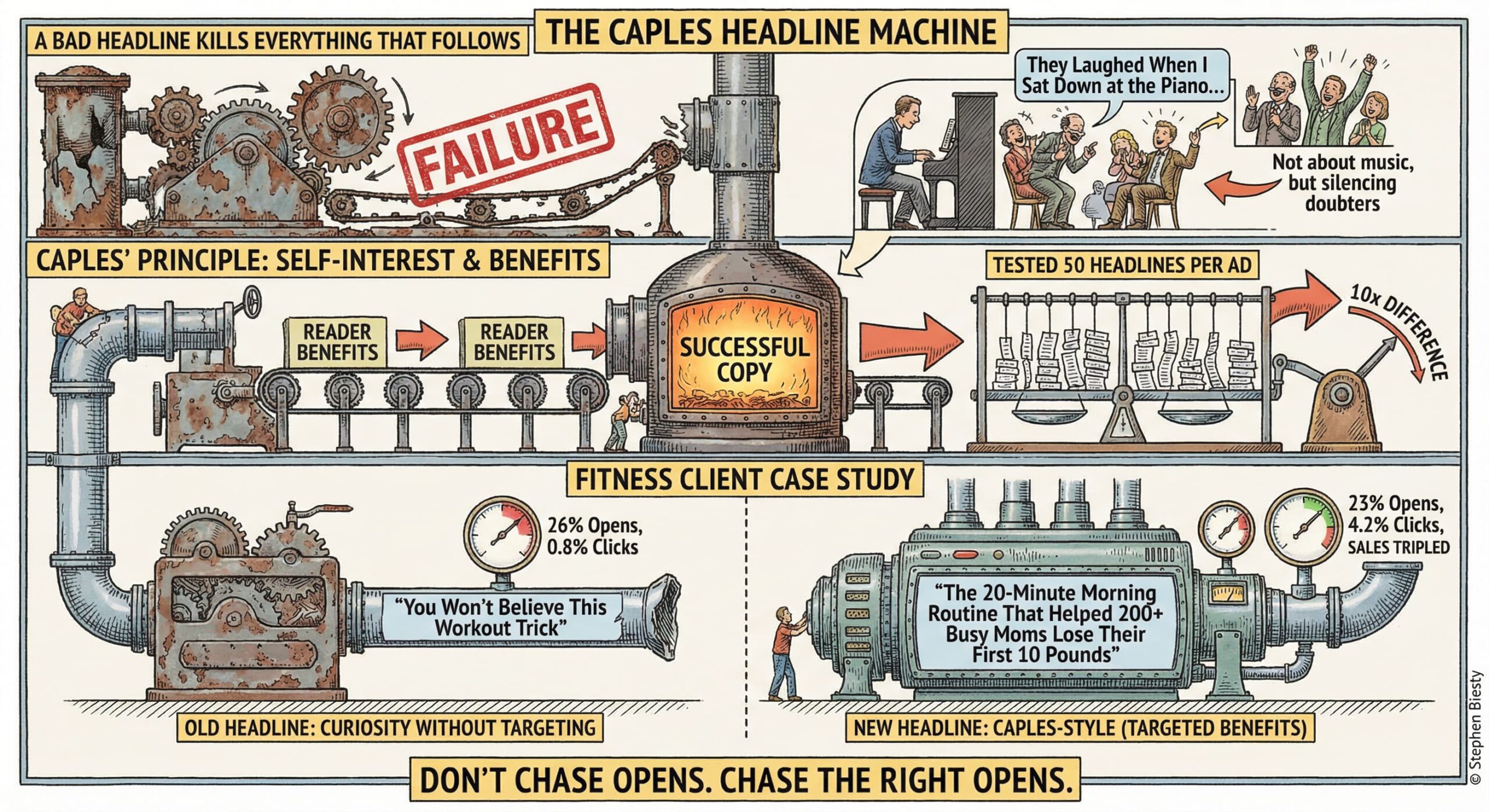 Caples wrote “They Laughed When I Sat Down at the Piano…” It wasn’t about music lessons, but about silencing your doubters. He tested up to 50 headlines per ad and proved the difference between great and mediocre could be 10x.