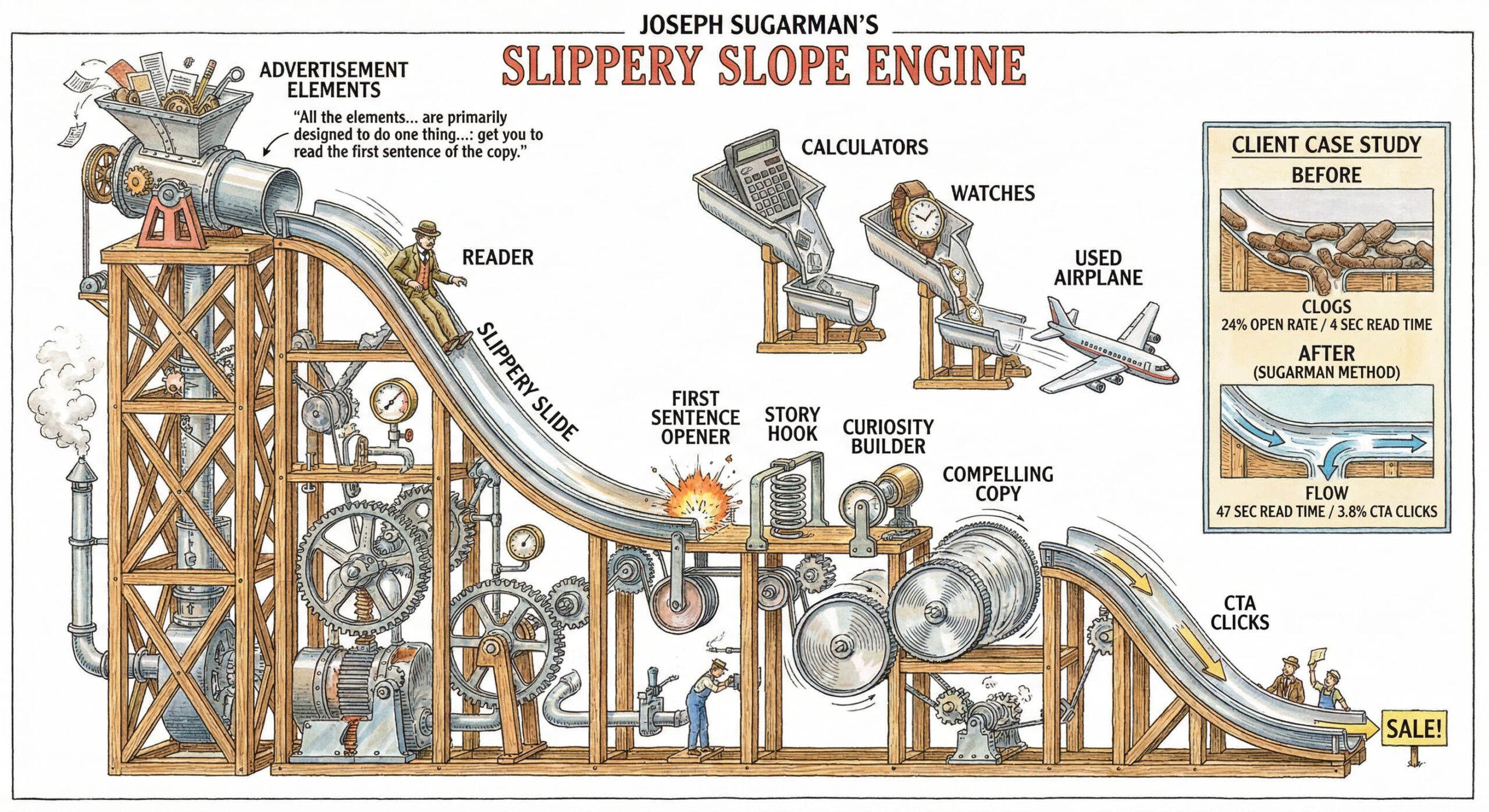 Sugarman sold calculators, watches, and even a used airplane through ads by making his copy impossible to stop reading. He called it the “slippery slide”: every sentence compels you to read the next.