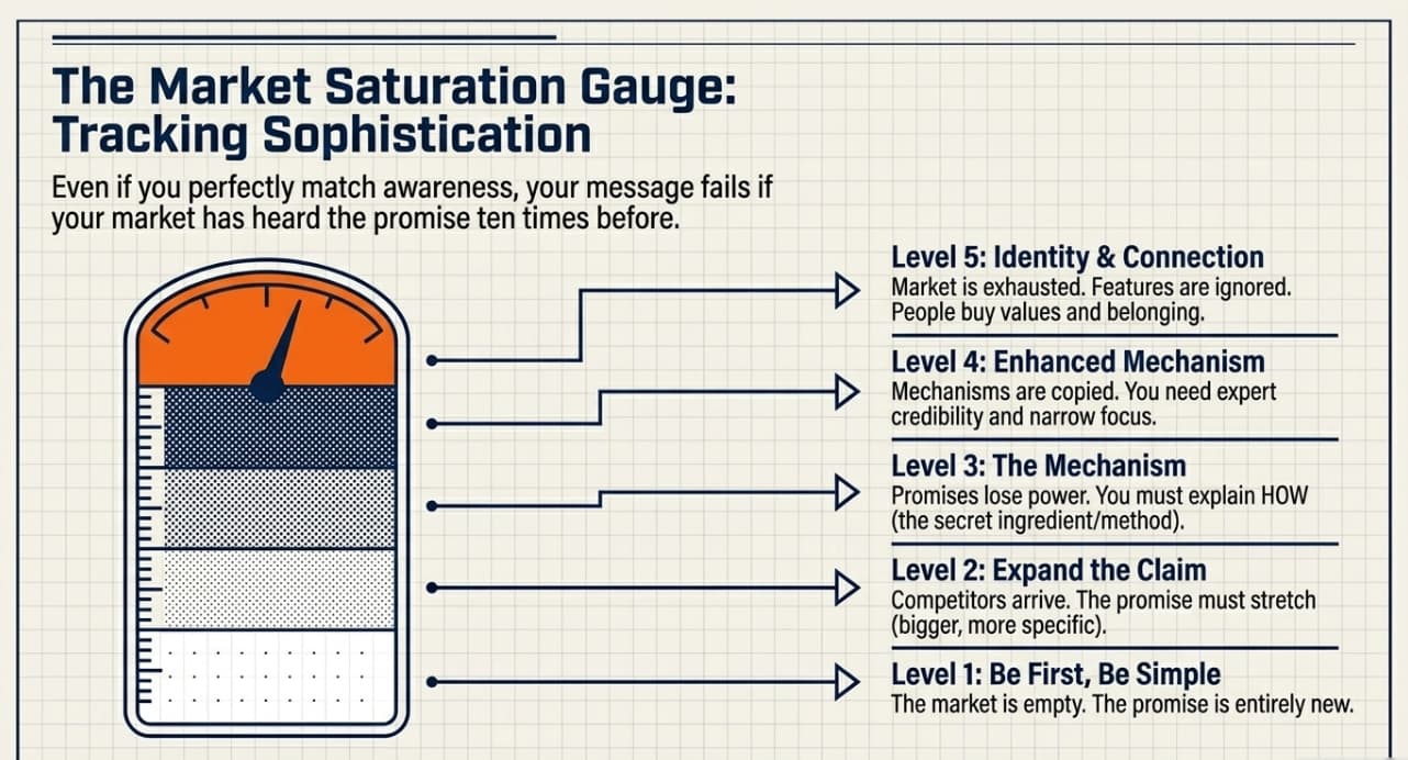 Awareness levels tell you where your customer is. Sophistication levels tell you where your market is. Even if you perfectly match your message to the customer’s awareness stage, it can still fail if your market has heard the same promise from ten other brands.